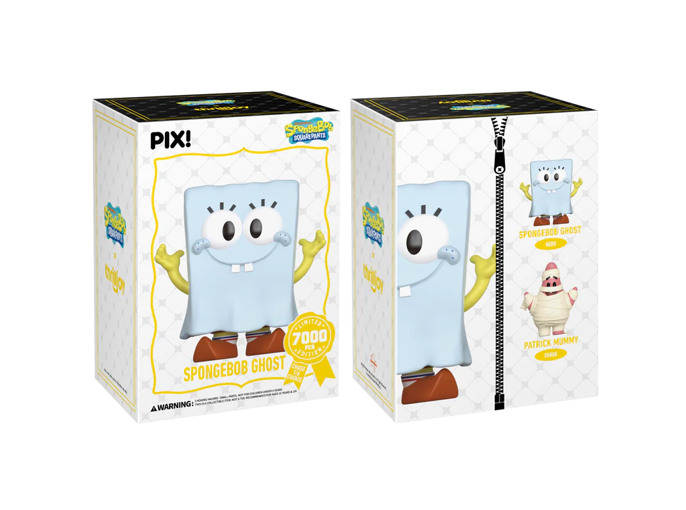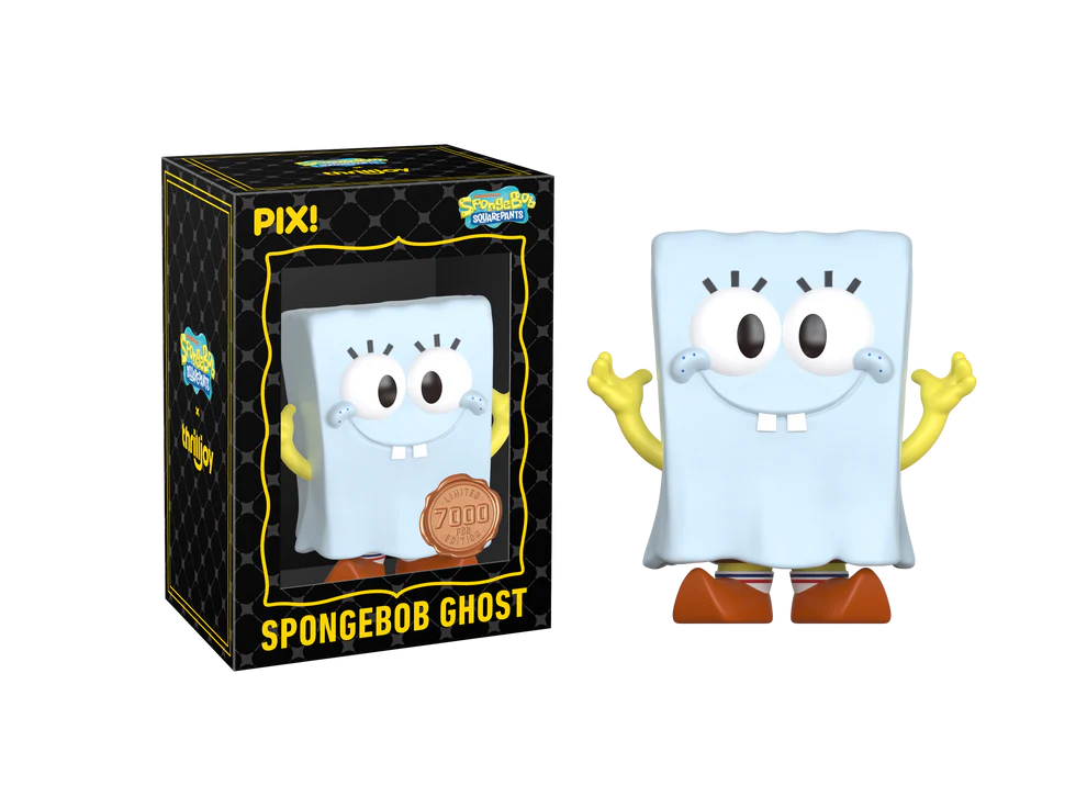 BOO! Featuring SpongeBob with a white sheet draped over his square body, two eye holes cut out for his big round eyes, and his smile still peeking through with his arms up! SpongeBob is leaving Bikini Bottom and heading straight to your shelves! This PIX! is perfect for all fans of classic Nickelodeon Cartoons!